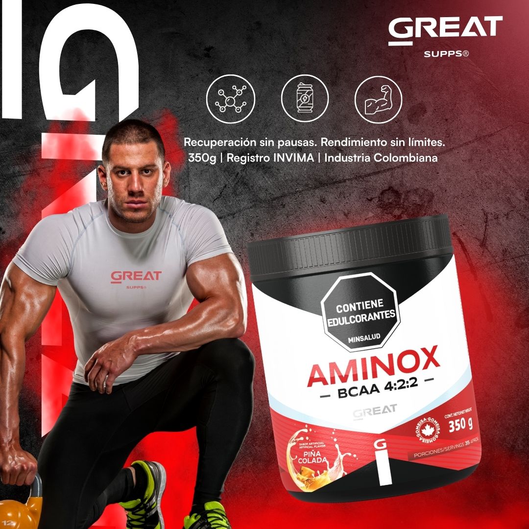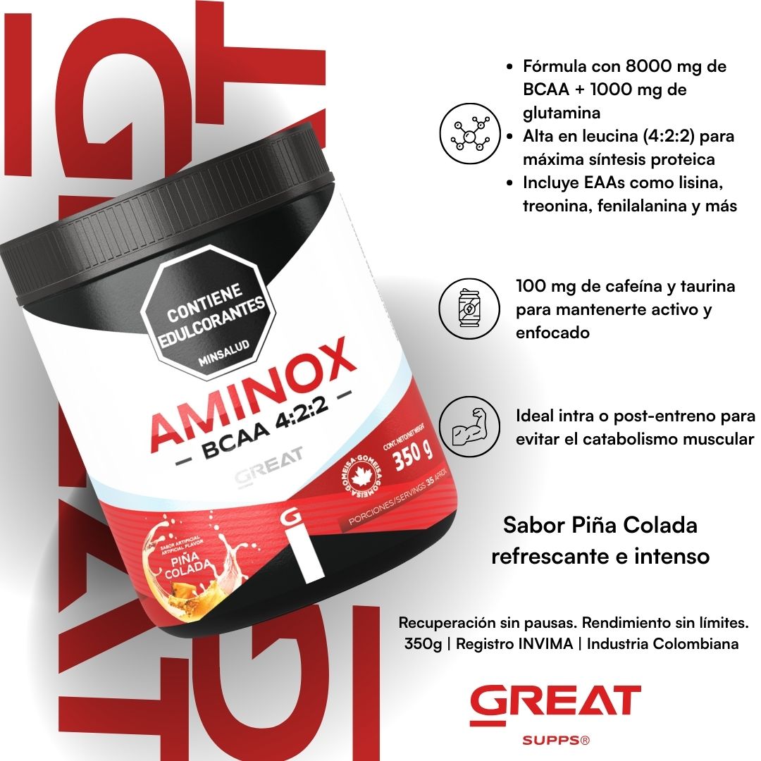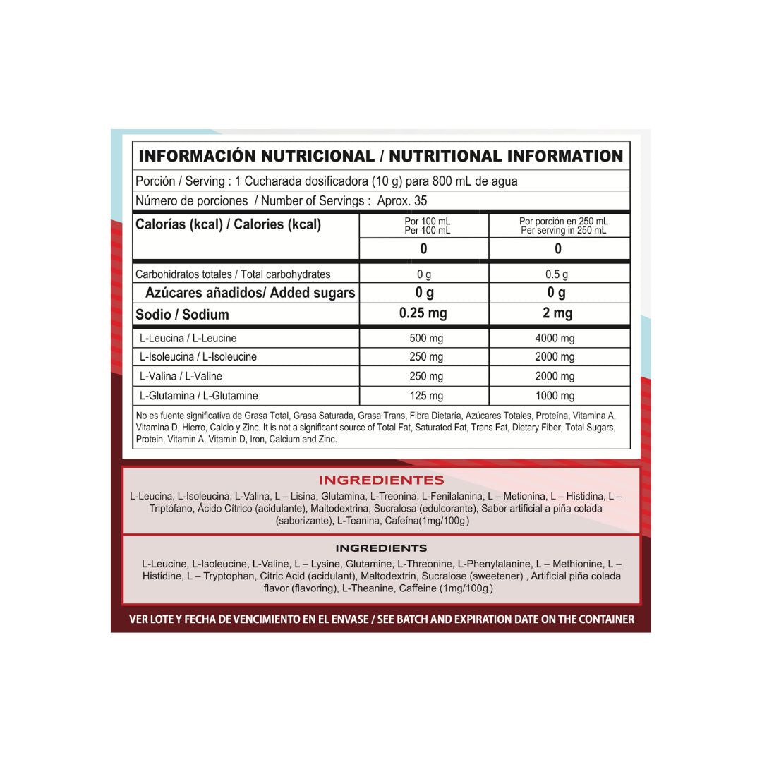 • BCAA en proporción 4:2:2 (Leucina 4g, Isoleucina 2g, Valina 2g por servicio).